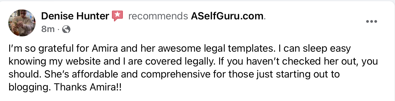 Of course, I found free legal templates but they didn't make me feel safe. Since Amira is a lawyer, I trusted her because of her legal expertise. I can honestly say; this was the best investment for my blog. If you are a new blogger, don't spend time looking for a free template because it mostly doesn't include all the legal protection. Amira's legal bundle/templates is what you will need to feel safe and protected.